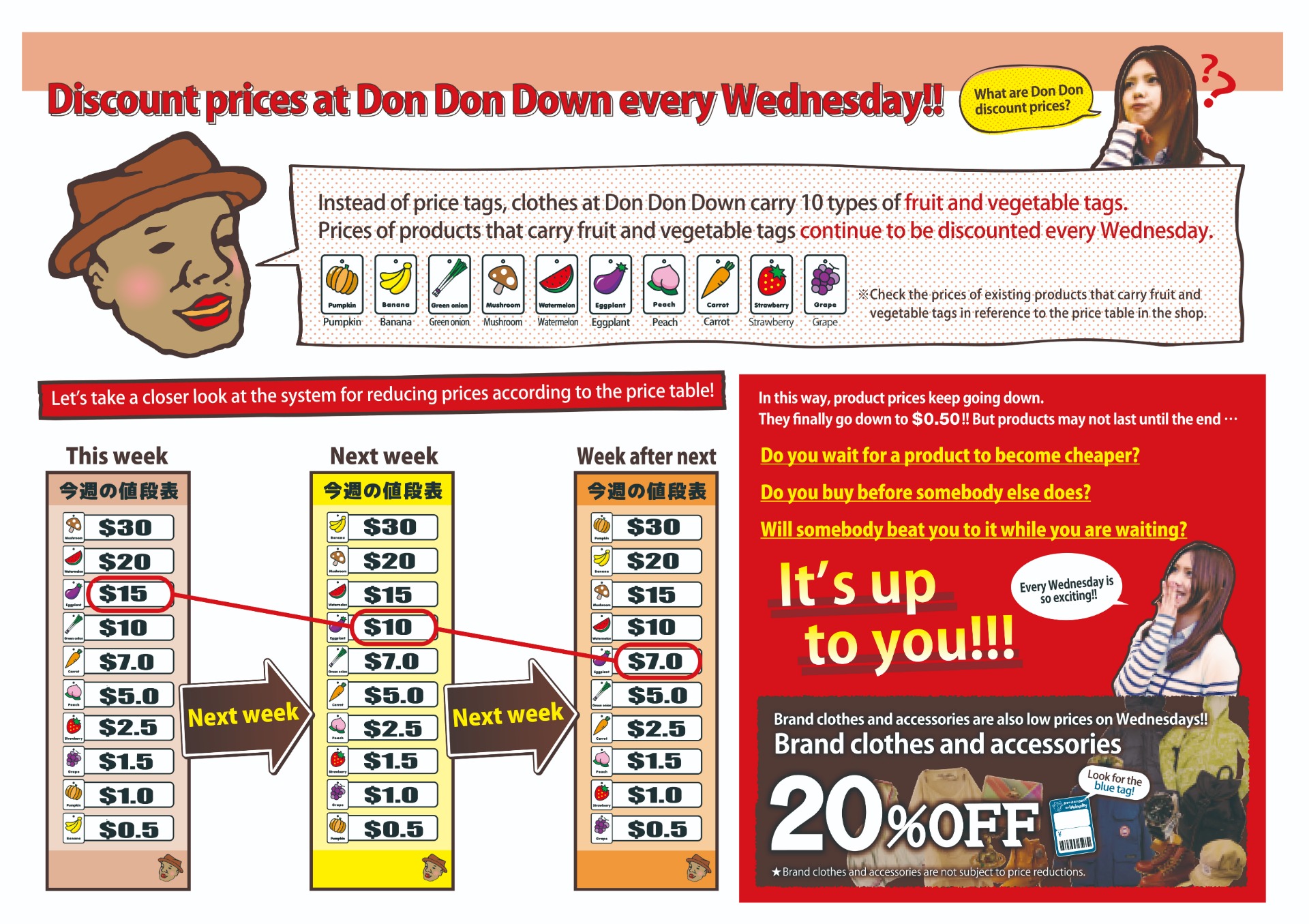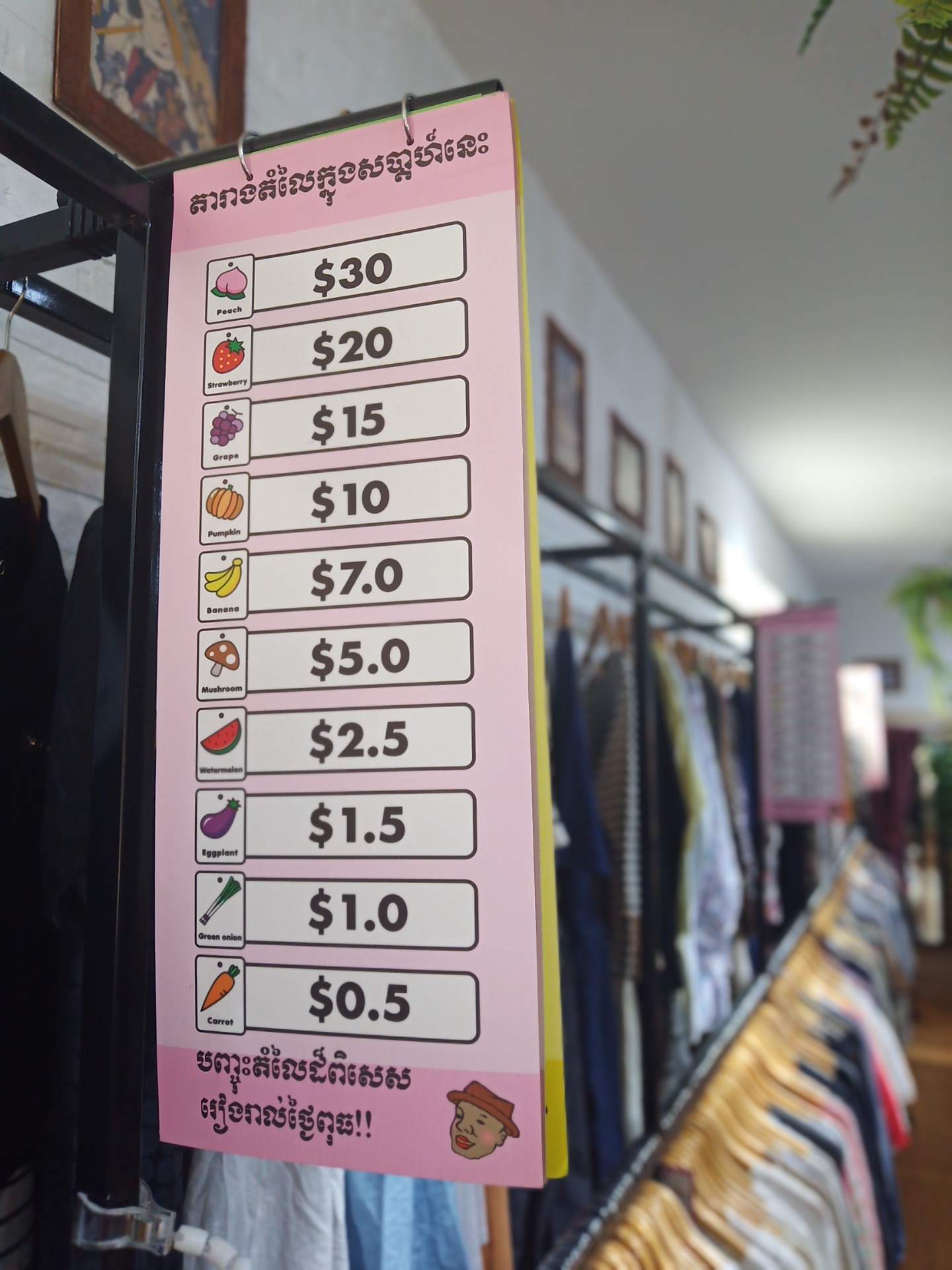 Any kind of cloth, Don Don Down does not have price tags like other retailers. Instead of that, we have what we call "Vegetable Tag".